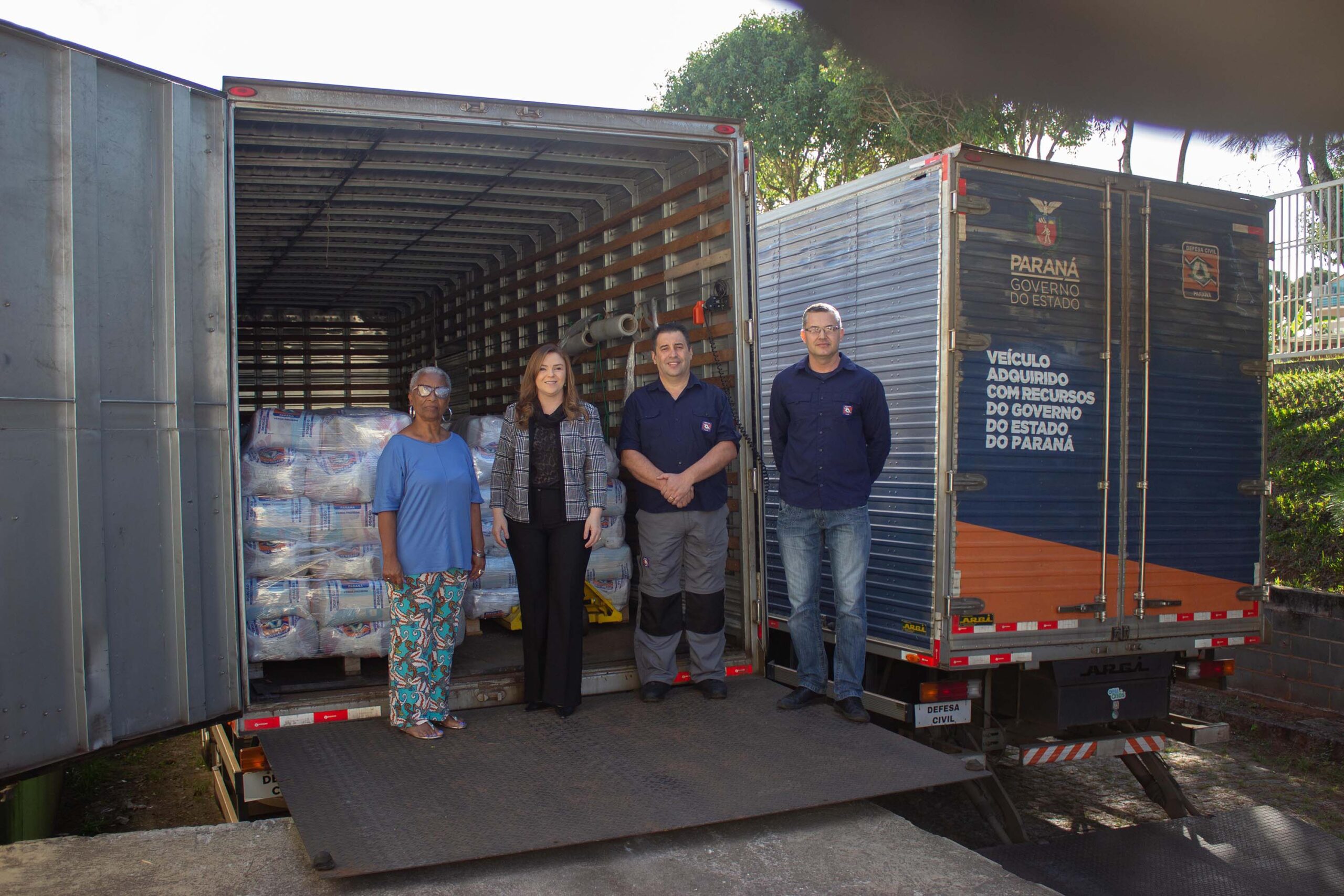 O carregamento das primeiras cestas foi acompanhada pela secretária estadual da Mulher e Igualdade Racial, Leandre Dal Ponte, e pelo coordenador executivo da Defesa Civil, tenente-coronel do Corpo de Bombeiros Adriano de Mello.