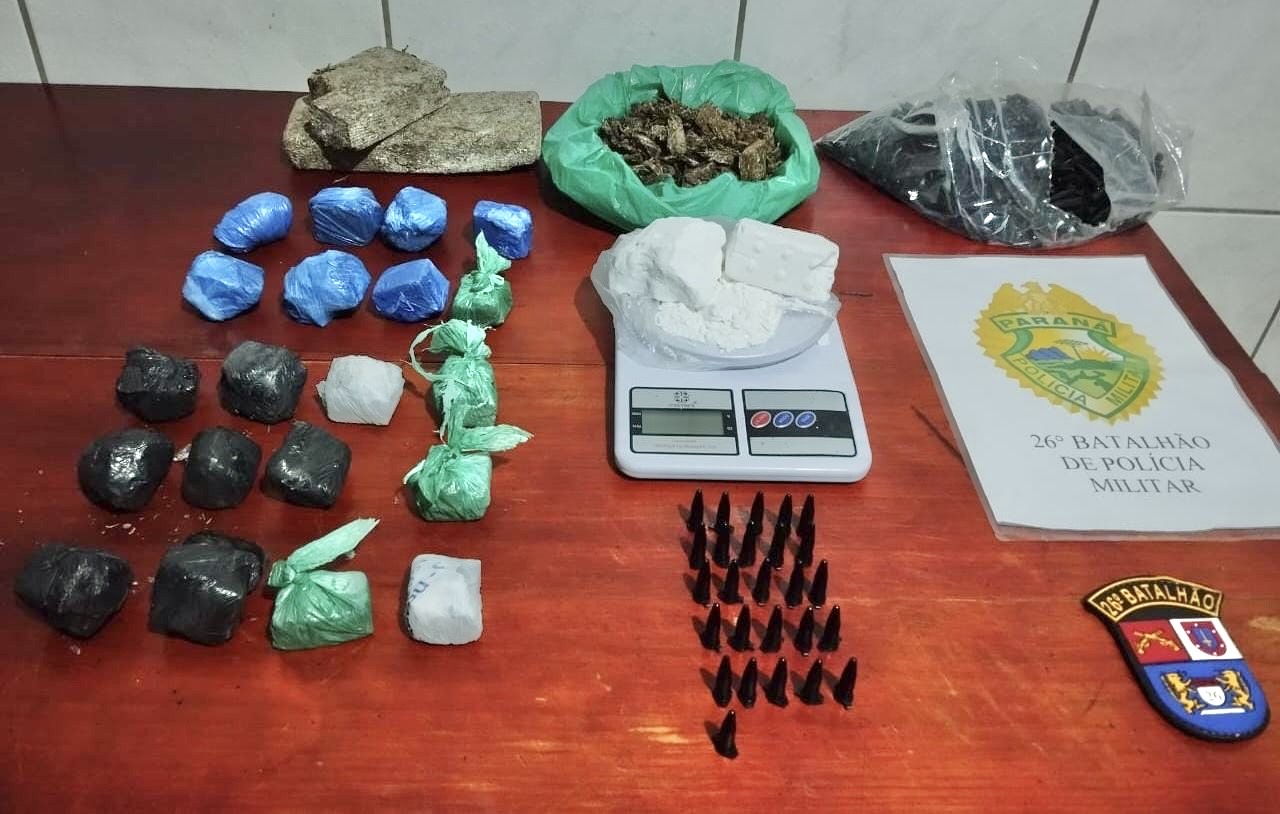 No local indicado, foram localizados 1,5 kg de maconha fracionada (20 porções embaladas individualmente), 330 gramas de cocaína em duas porções, 600 pinos vazios para acondicionamento de droga, uma balança de precisão e documentos vinculados a indivíduos já conhecidos pelo tráfico.