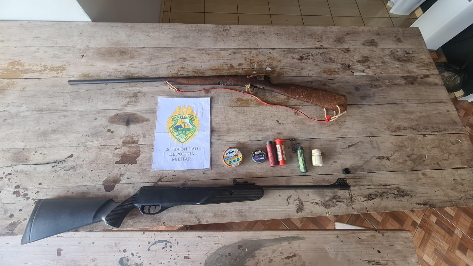 Ao ir até o local e fazer a abordagem do denunciado, a PM encontrou a espingarda de fabricação caseira, uma carabina de pressão, munições e projéteis de chumbo.