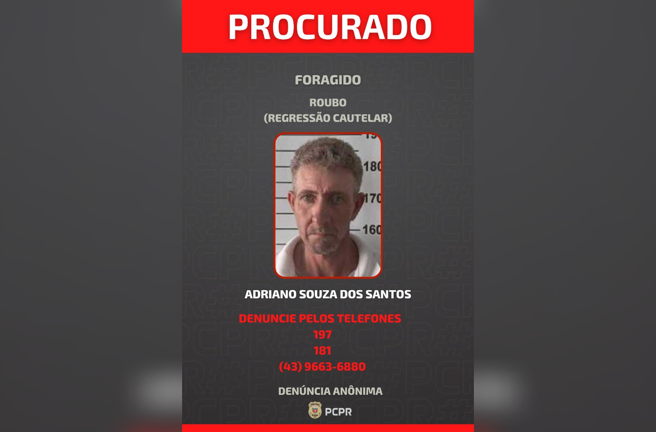 A Polícia Civil do Paraná (PCPR) divulgou nesta quinta-feira (23) a foto de Adriano Souza dos Santos (46 anos) foragido pelo crime de roubo ocorrido na zona rural de Cândido de Abreu.