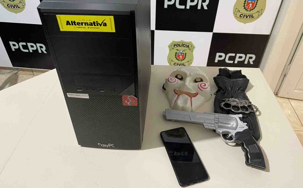 No local foram apreendidos: simulacro de arma de fogo, computador pessoal do adolescente; celular; soco inglês e uma máscara de palhaço.