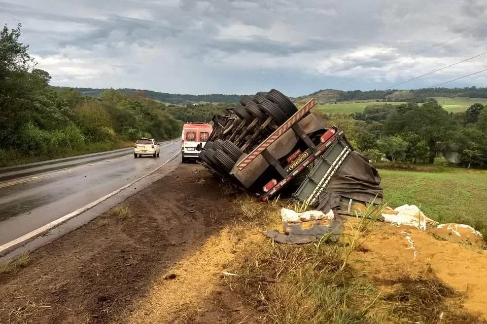 Segundo a Polícia Militar (PM), a equipe trafegava pela rodovia, por volta das 9h, quando foi abordada, próximo ao Rio XV, onde o motorista contou que perdeu o controle do veículo, saiu da pista com seu caminhão Scania e tombou às margens da pista sentido Pitanga.