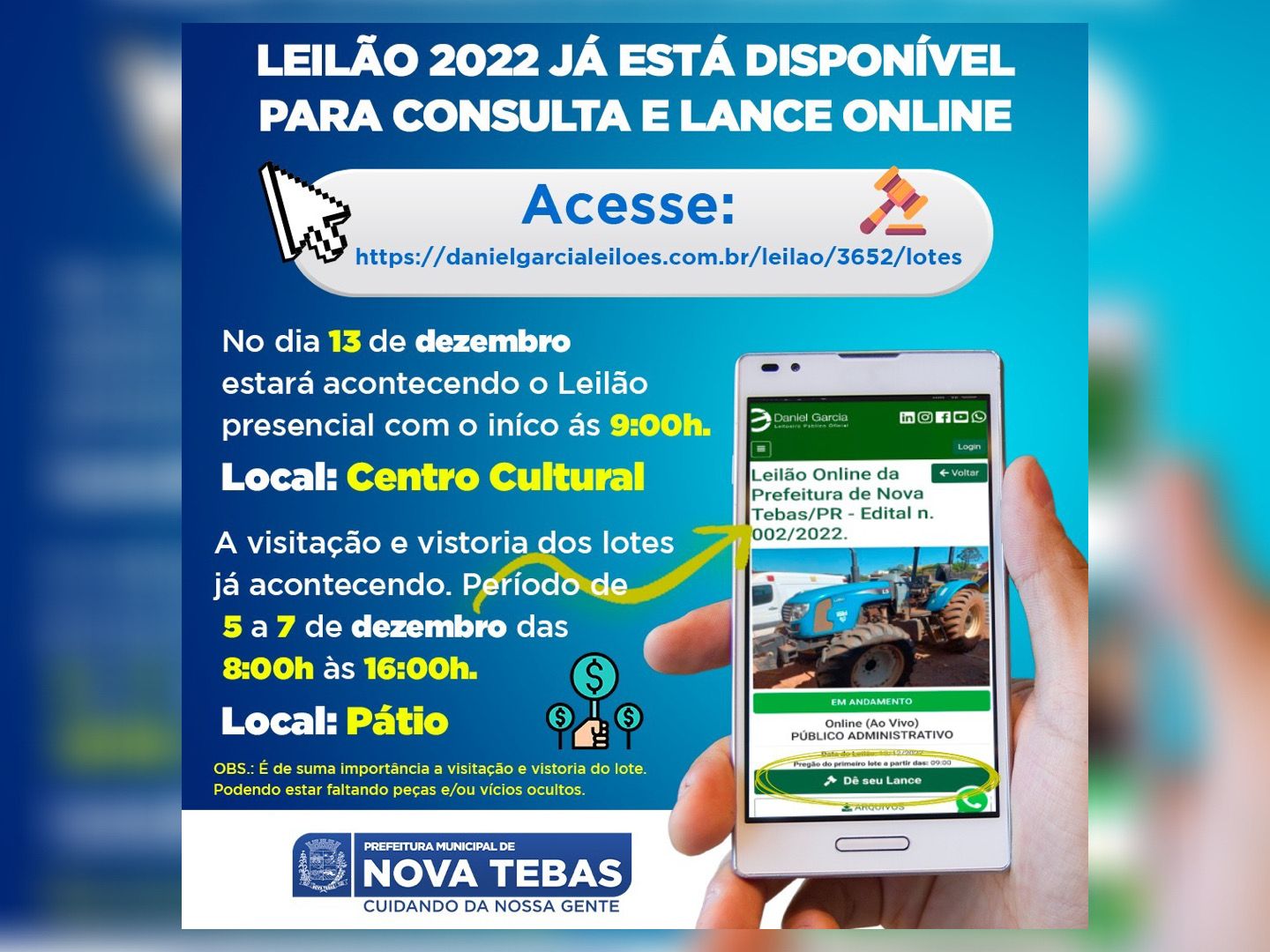 O leilão 2022 da Prefeitura de Nova Tebas já está acontecendo e está disponível para consultas e lances online.