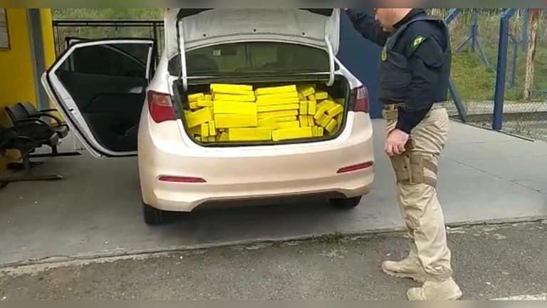 A equipe da PRF encontrou a droga no porta-malas do veículo. Na fiscalização, os policiais também identificaram que o automóvel estava com as placas clonadas.