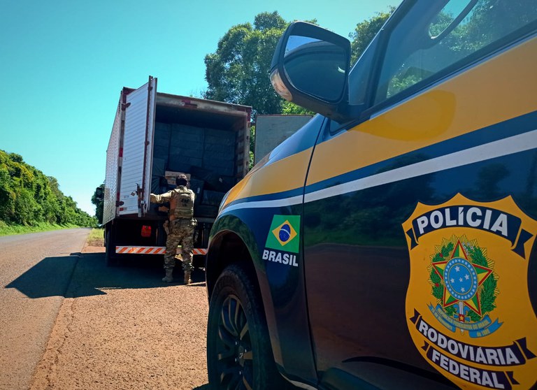 A PRF abordou um caminhão baú que estava carregado com cerca de 140 mil maços de cigarros contrabandeados do Paraguai.