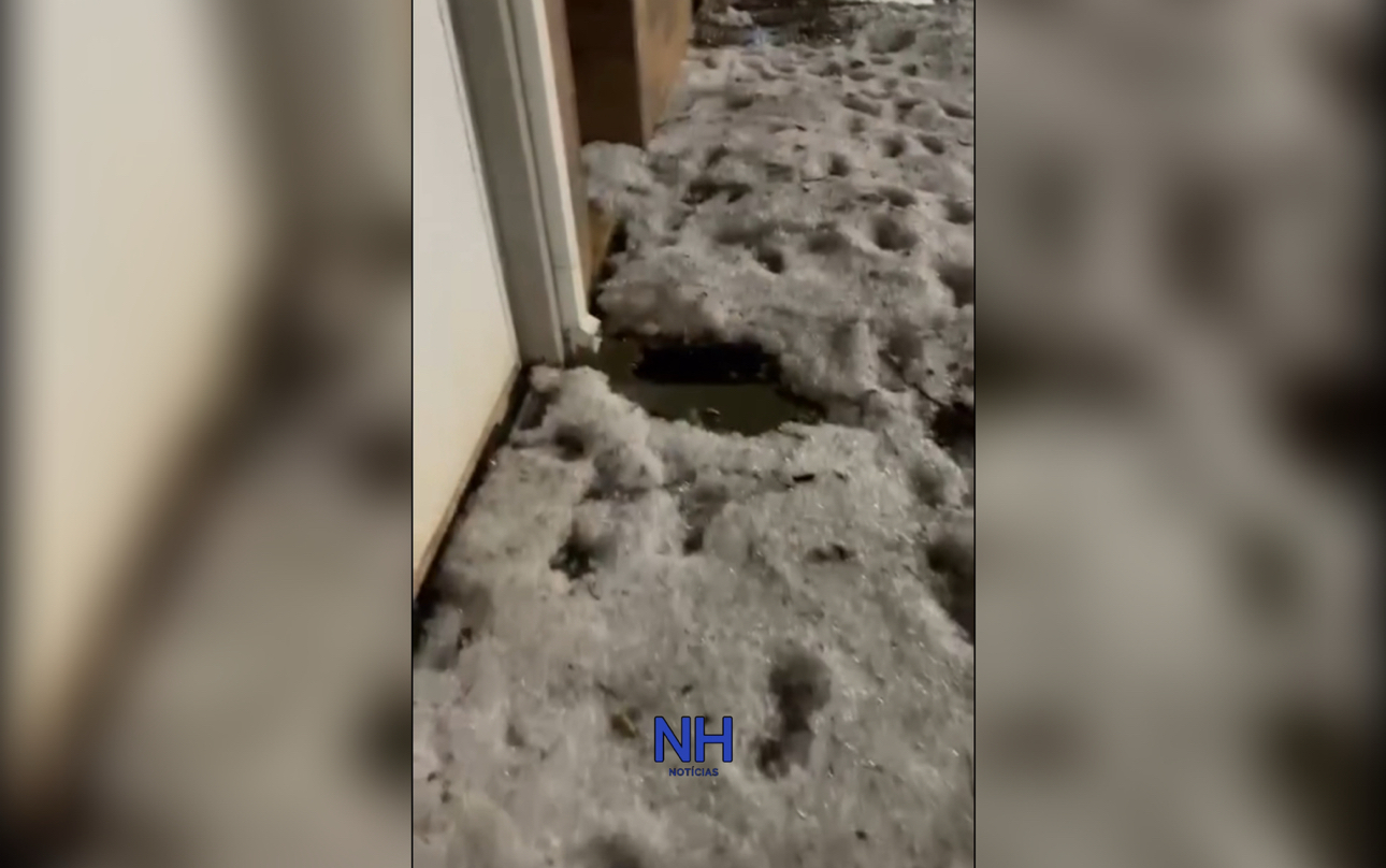 Vídeos compartilhados nas redes sociais mostram ruas completamente alagadas, pedras de gelo cobrindo calçadas e veículos e o intenso volume de chuva que caiu em curto espaço de tempo.