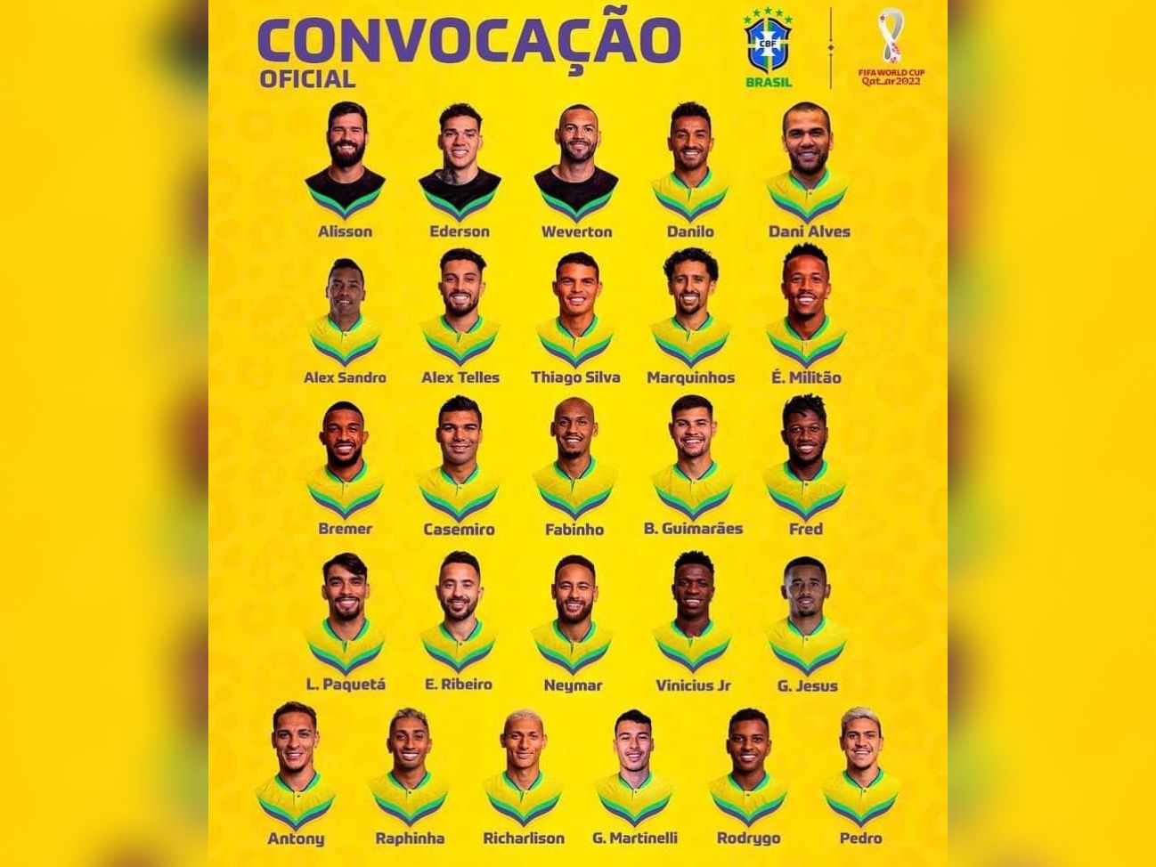 Atacantes: Neymar (Paris Saint-Germain-FRA), Vinícius Júnior (Real Madrid-ESP), Rodrygo (Real Madrid-ESP), Raphinha (Barcelona-ESP), Richarlison (Tottenham Hotspur-ING), Gabriel Jesus (Arsenal-ING), Pedro (Flamengo), Antony (Manchester United-ING) e Gabriel Martinelli (Arsenal-ING).