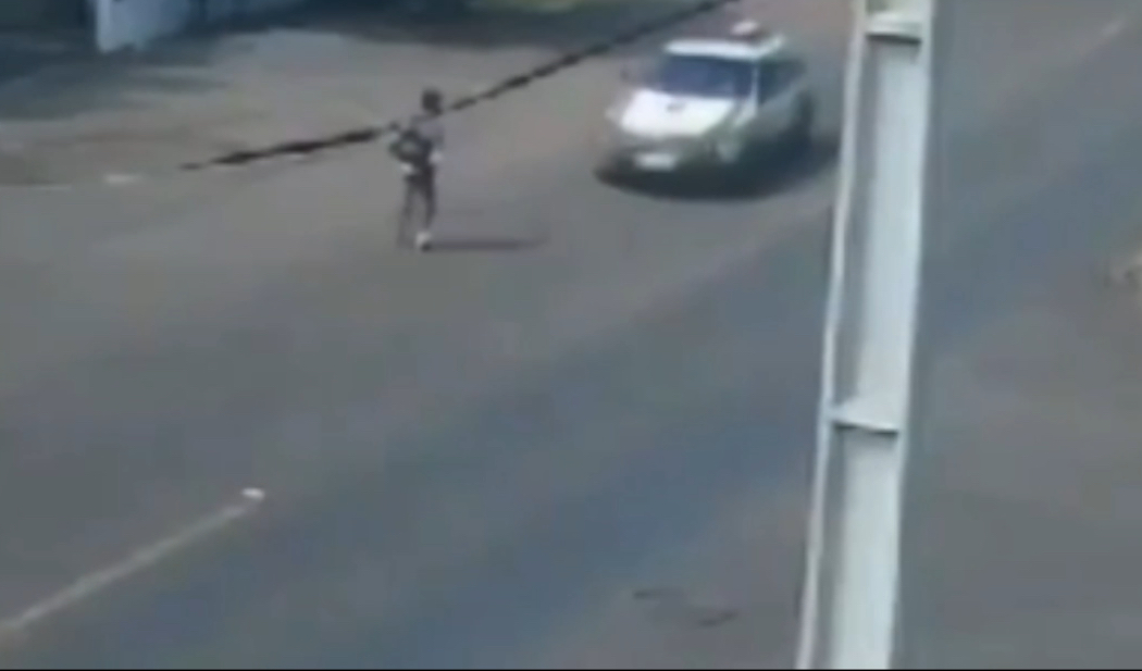 As imagens mostram o pedestre caminhando lentamente no meio da rua. Alguns veículos desviam, até que a viatura da PM atinge o homem, que cai ao chão. Na sequência, o condutor dá a ré e tanto ele, quanto um passageiro descem do carro oficial para verificar a situação.